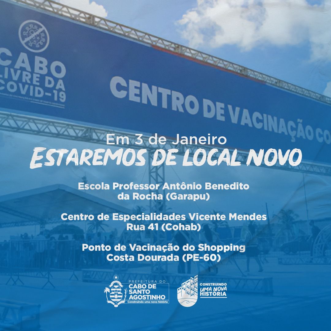 A partir da próxima segunda-feira (03), a Prefeitura do Cabo de Santo Agostinho vai transferir o Centro de Vacinação da Covid-19, da Praça Nove de Julho, para outros locais. São eles: Escola Municipal Prof. Antônio Benedito da Rocha, localizada em Garapu, e o Centro de Especialidades Vicente Mendes, na Cohab.